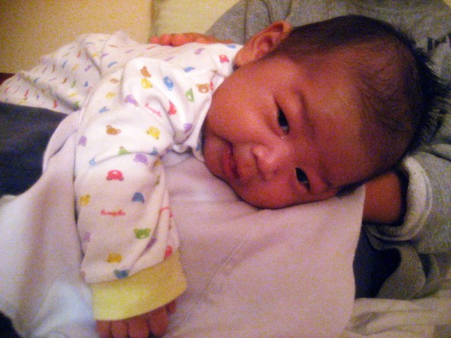 Content on mom’s lap. Burping.